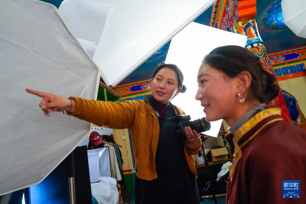 在“欽樂工坊”的攝影棚,達(dá)瓦卓瑪(左)指導(dǎo)模特如何擺姿勢拍攝品牌耳釘飾品(11月4日攝)。新華社記者 沈伯韓 攝