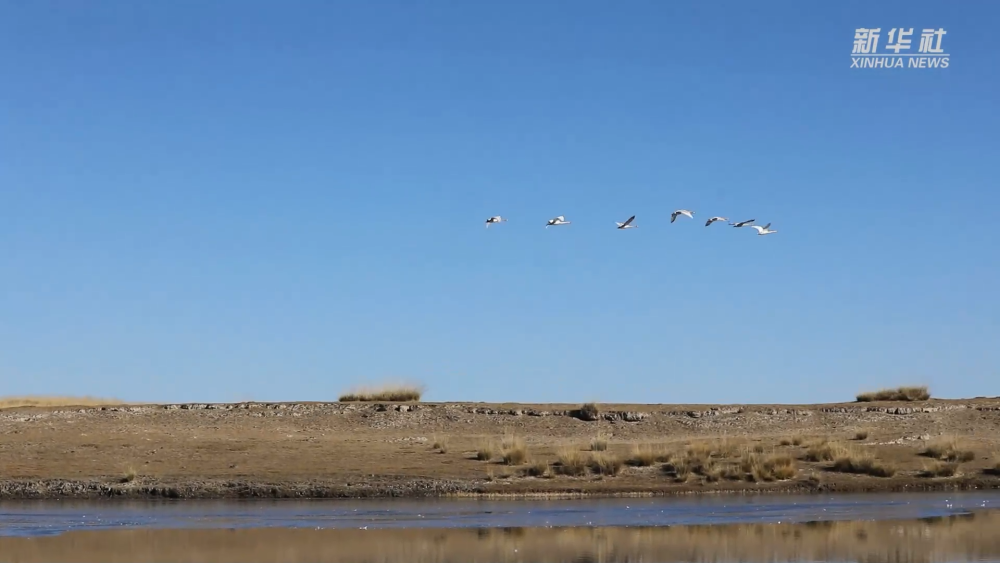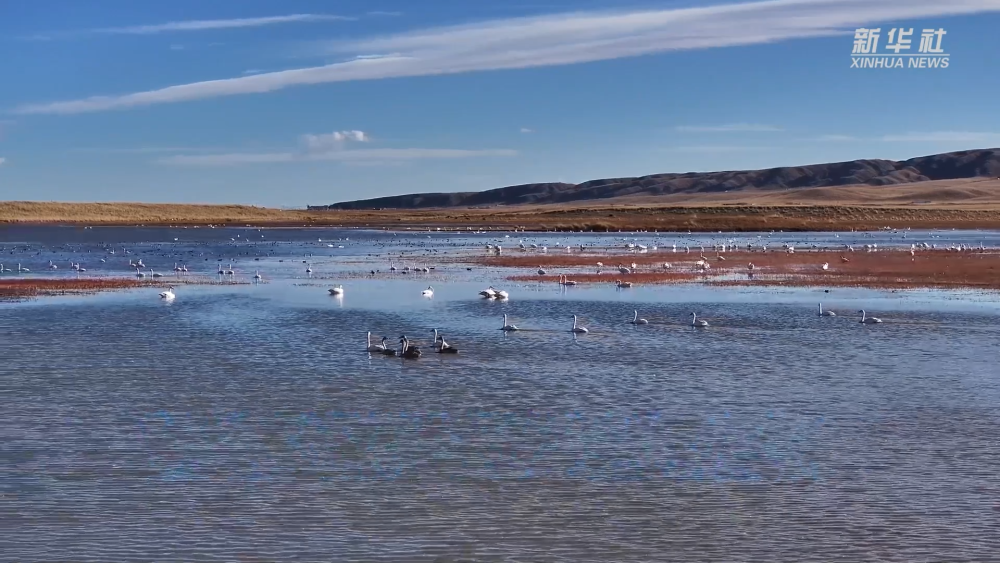 初冬時(shí)節(jié),在位于青海省海北藏族自治州剛察縣的青海湖畔,成百上千只大天鵝在此越冬棲息。成群的大天鵝時(shí)而振翅飛翔,時(shí)而戲水覓食,與碧藍(lán)澄澈的青海湖和岸邊的草原相映成景,構(gòu)成一幅美麗畫卷。