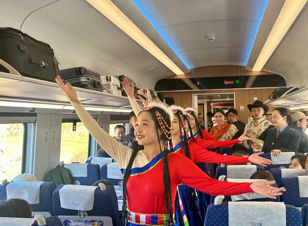 11月25日,“發(fā)現(xiàn)最美鐵路·尋夢香格里拉”活動中,乘務(wù)員向游客介紹麗香鐵路并表演節(jié)目。新華社記者 陸君鈺 攝