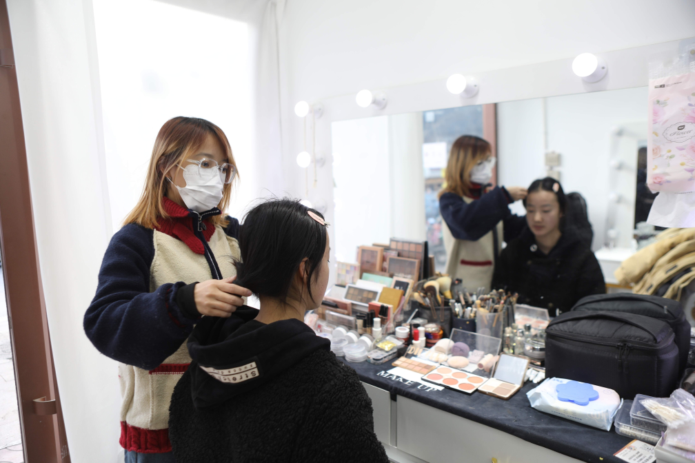 蒙春芳(左一)正在給客人化妝。新華社記者 張睿 攝