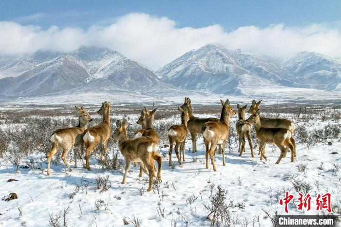 2025年2月中下旬,雪后初霽的祁連山東段武威天祝馬牙雪山下,野生保護動物狍鹿和馬鹿在雪地中撒歡。王守輝 攝