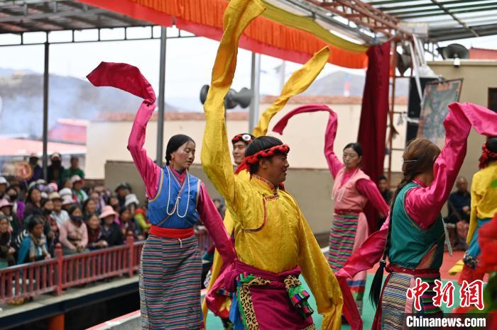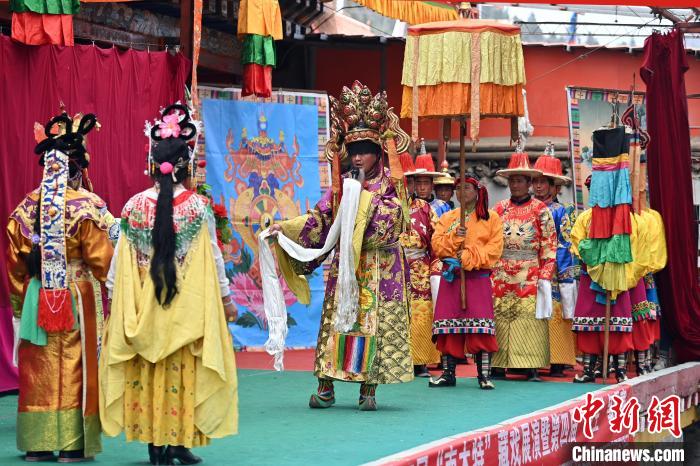 5月7日,在甘肅甘南藏族自治州碌曲縣雙岔鎮(zhèn)二地村,當(dāng)?shù)卮迕裱堇[傳統(tǒng)八大藏戲之一的 《諾桑王子》 。中新社記者 九美旦增 攝
