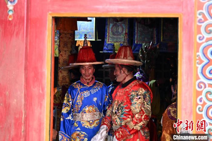 圖為演出人員在后臺整理服飾準(zhǔn)備上臺。中新社記者 九美旦增 攝