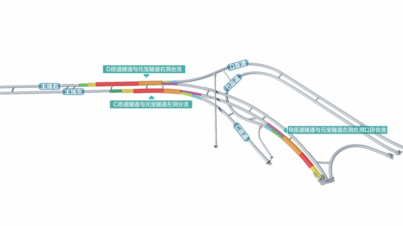 最大的挑戰(zhàn)之一是隧道交疊。在元寶樞紐地下互通中,B匝道隧道與主線元寶隧道左右洞上下交叉,共有三個(gè)交叉影響段落,分別是95米、70米、50米,上下隧道垂直高差最短處僅為33厘米,相當(dāng)于上下兩條隧道幾乎緊緊挨在一起,而兩條隧道總開(kāi)挖高度又接近21米,相當(dāng)于7層樓高?!霸谒淼郎显傩匏淼?,稍有不慎就可能引發(fā)垮塌等事故?!绷沃拘f(shuō),交疊隧道的部分還未施工,因?yàn)轫?xiàng)目是世界之最,可供參考的案例很少,目前正和科研團(tuán)隊(duì)一起,研究系統(tǒng)化的技術(shù)解決方案,為山區(qū)大型地下互通建設(shè)探路。