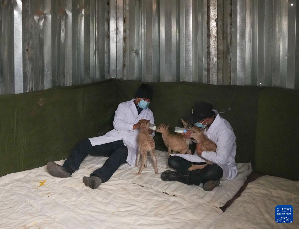 巡山隊員在可可西里卓乃湖保護站給救助的小藏羚羊喂奶(7月2日攝)。新華社記者 杜笑微 攝