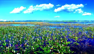 藍(lán)天白云下的甘南骨麻湖,四周環(huán)繞著原始森林和高山草甸。鐘建龍 攝