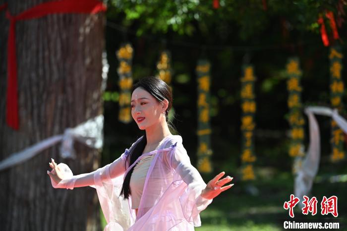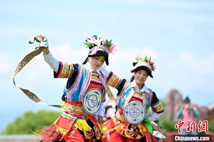 圖為7月13日,工作人員在“簪花之路”途經的“三生三世”景區(qū)表演節(jié)目。九美旦增 攝