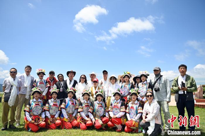 圖為7月13日,在舟曲拉尕山上,2025海外華文媒體甘南行采訪團成員與身穿傳統(tǒng)博峪服飾的藏族女孩們合影留念。九美旦增 攝