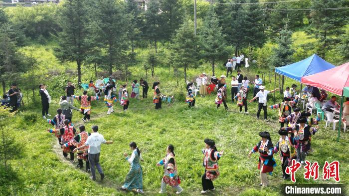圖為7月13日,藏族民眾在“簪花之路”途經的沙灘國家森林公園跳鍋莊舞。(無人機照片)九美旦增 攝