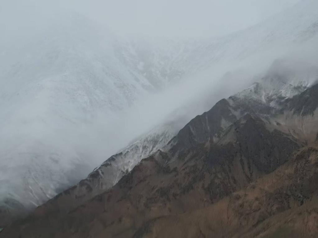 半個小時之后,風(fēng)勢在幾滴雨點的打擊下,漸漸緩和下來。當(dāng)沙幕隱去,露出被磨洗過的藍(lán)天時,我們都長舒了一口氣。擋風(fēng)玻璃上的兩側(cè),裹了厚厚一層泥巴。遠(yuǎn)處的山峰頂上,白雪在太陽的余暉下,染成了金黃。
