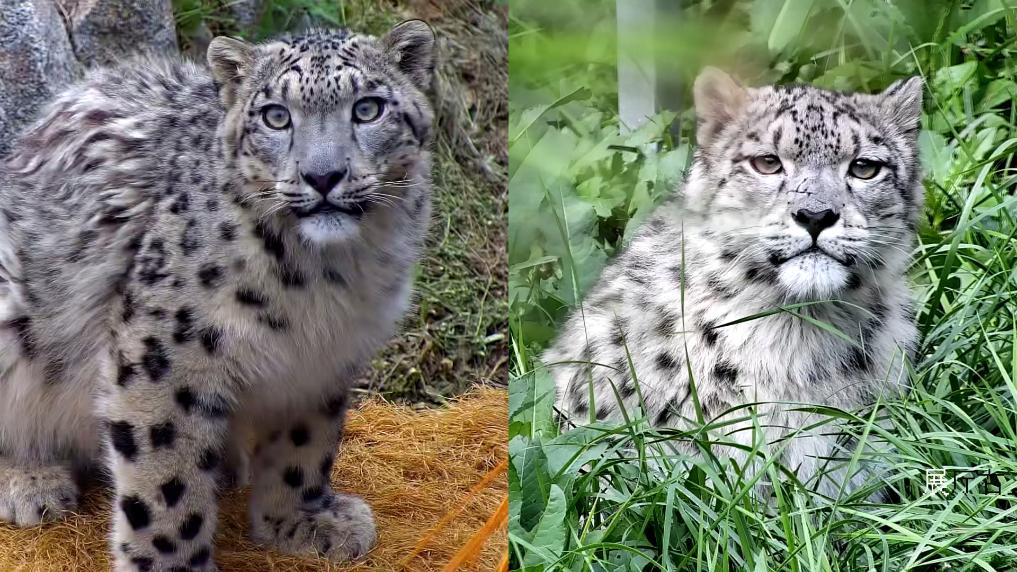 雪豹“凌小蟄”和“凌小芒”近照,它們被親切地稱作“蟄么芒”。(拼版照片)