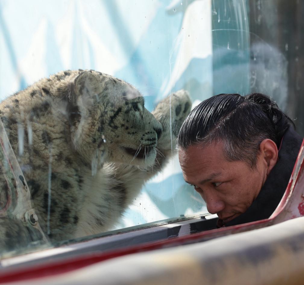 雪豹“凌小蟄”在雪豹館和獸醫(yī)趙海龍隔窗互動。