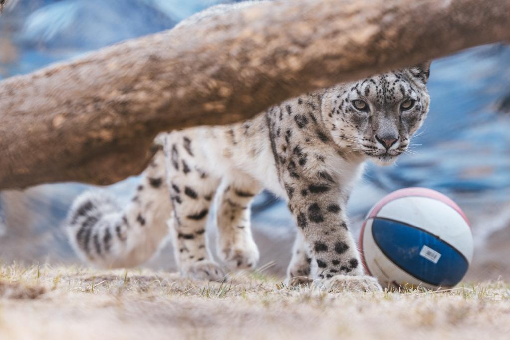 雪豹“凌小蟄”在雪豹館內(nèi)和“大黃鴨”玩具玩耍。