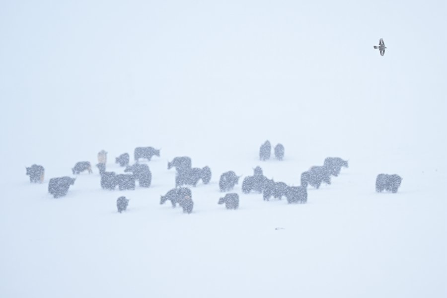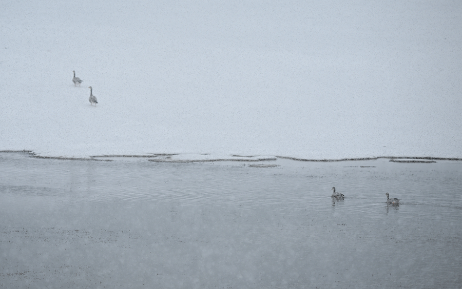 令人驚喜的是,風(fēng)雪中的源頭并不冷清。三五成群的藏野驢在緩坡上覓食,棕褐色的脊背上落滿雪花,卻走得從容不迫;幾只藏原羚從遠(yuǎn)處躍過雪地,靈巧的身影在風(fēng)雪中一閃而過,很快消失;斑頭雁貼著湖面低飛,時(shí)而盤旋,時(shí)而鳧水。這樣的場景,在當(dāng)?shù)厣鷳B(tài)管護(hù)員看來,已不罕見。