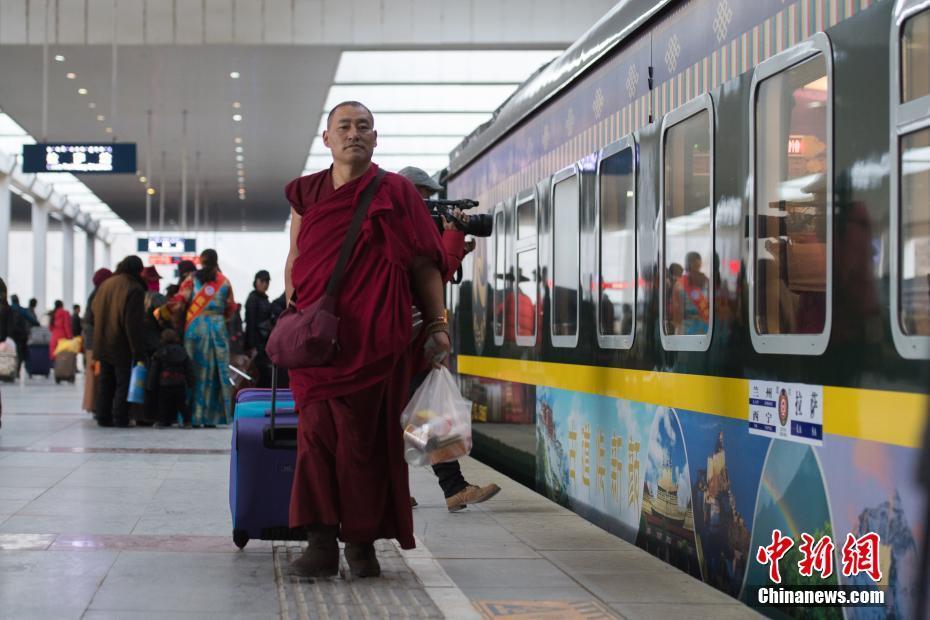 2月1日,西藏拉薩火車(chē)站迎來(lái)2018首個(gè)春運(yùn)日。拉薩站當(dāng)天發(fā)客量5000多人次,旅客多以返鄉(xiāng)務(wù)工人員、學(xué)生為主,其中乘坐到成都、廣州等方向的旅客人數(shù)最多。初步統(tǒng)計(jì),今年春運(yùn)拉薩站將輸送旅客約16.5萬(wàn)人次,日均發(fā)客量約4200人次。圖為拉薩站,一名僧人即將上車(chē)。中新社記者 何蓬磊 攝