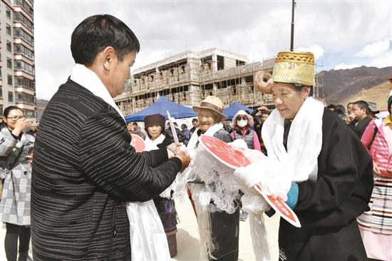 圖為扶貧搬遷群眾領(lǐng)到新房鑰匙。平措旺堆 攝