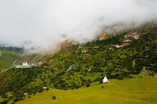 紅白相間的建筑群,牦牛或狗悠然自得地臥著;偶爾有幾個(gè)僧人慢慢走過(guò),或論著經(jīng)書,或拿水壺……世俗與修行,喧囂與寧?kù)o,在這里有著絕妙地平衡。