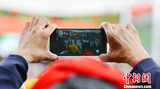 近年,西藏藏戲得到快速發(fā)展,展演活動(dòng)越來(lái)越多。圖為8月30日,拉薩雪頓節(jié)藏戲展演活動(dòng)上,一名外圍觀眾因無(wú)法觀看到表演,只好高舉手機(jī)進(jìn)行記錄。江飛波 攝