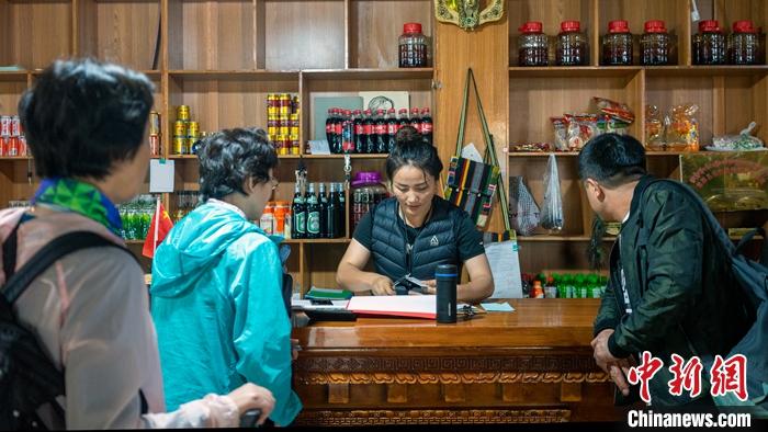 7月17日,雅魯藏布江大峽谷景區(qū)內(nèi),德吉旺姆為客人辦理入住。34歲的德吉旺姆經(jīng)營著擁有73間客房的公尊德姆農(nóng)莊,該農(nóng)莊位于雅魯藏布江左岸,天氣晴朗時,遠(yuǎn)處的南迦巴瓦峰清晰可見。 中新社記者 江飛波 攝