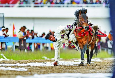 8月10日,2020年那曲羌塘恰青格薩爾賽馬藝術(shù)節(jié)在西藏那曲市格薩爾賽馬場開幕。圖為騎手在藝術(shù)節(jié)開幕式上表演騎馬撿哈達。新華社記者 張汝鋒 攝