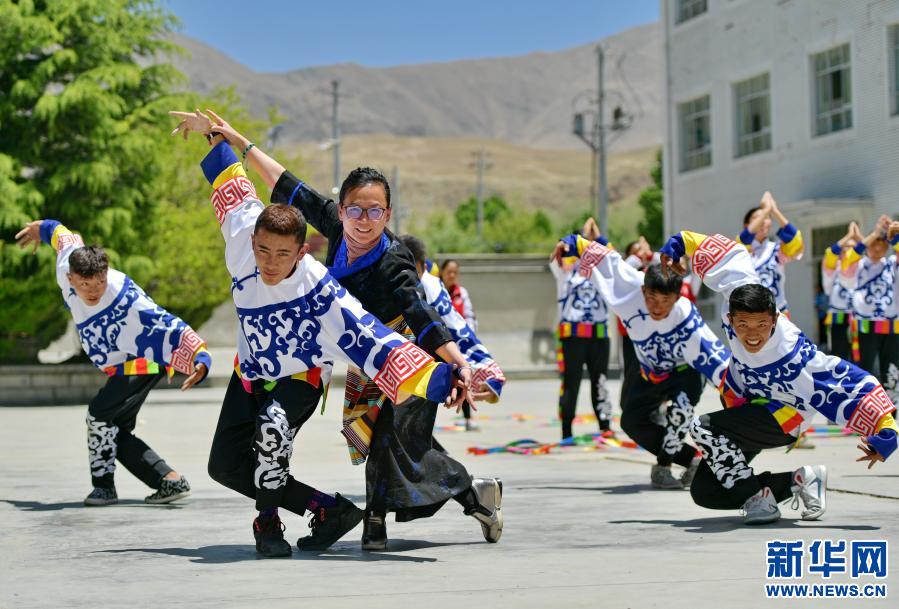 5月8日,在西藏山南市第一高級(jí)中學(xué),來(lái)自湖北省武漢市旅游學(xué)校的援藏教師馬丹(左三)指導(dǎo)學(xué)生練習(xí)校園啦啦操。新華社記者 張汝鋒 攝