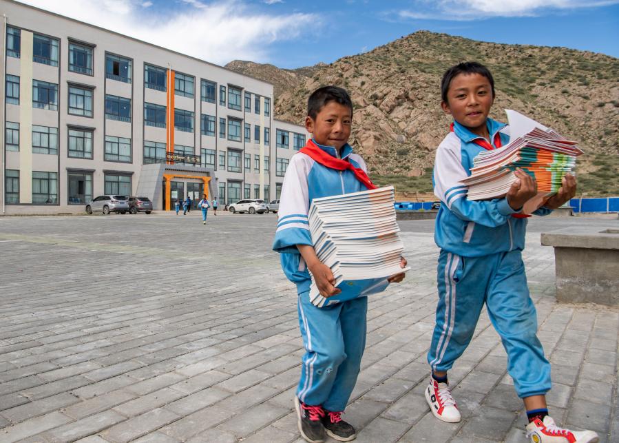 在森布日幸福家園九年一貫制學(xué)校,剛開學(xué)的學(xué)生們在搬新書(2020年8月24日攝)。這個學(xué)校坐落在山南市貢嘎縣森布日搬遷安置點旁,從高海拔地區(qū)搬遷至此的孩子們可以就近入學(xué)。新華社記者 孫非 攝