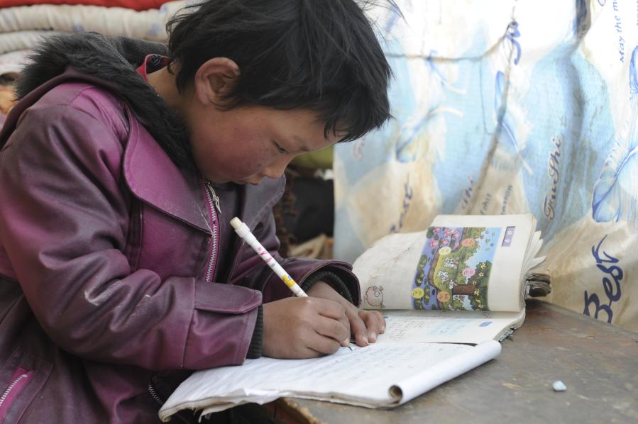 西藏雙湖縣嘎措鄉(xiāng)的一名學(xué)生在家中寫作業(yè)(2013年1月7日攝)。新華社記者 覺果 攝