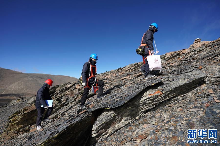在西藏山南市洛扎縣,國(guó)家電網(wǎng)山南供電公司輸電運(yùn)檢中心員工龔朝偉(右)和國(guó)家電網(wǎng)安徽省電力有限公司援藏工作人員徐四勤(中)、吳寅(左)向浪洛線197號(hào)鐵塔前進(jìn)(2020年11月4日攝)。新華社記者詹彥 攝