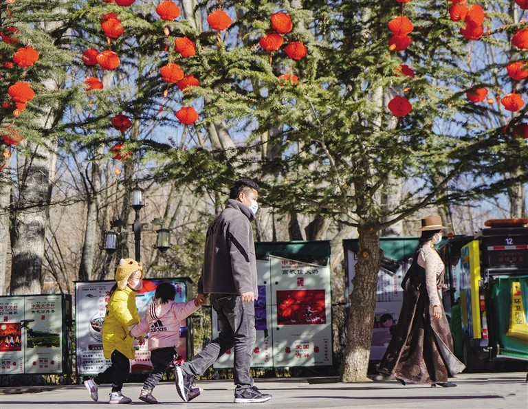 結束晨練的邊珍正在給紅燈籠下一蹦一跳玩耍的孫女拍照,“到處都掛滿了紅燈籠,把公園裝扮得格外喜慶,很有節(jié)日的氣息?!边呎湔f。