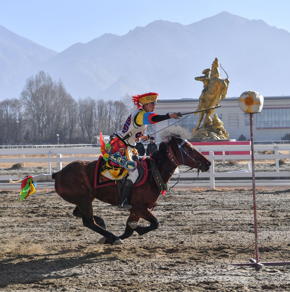 一名騎手在進(jìn)行馬術(shù)射箭表演。新華社記者晉美多吉攝
