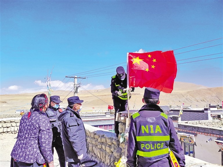 圖為崗巴縣移民警察與當?shù)厝罕娨黄饸g度“雙節(jié)”,一起更換屋頂五星紅旗。扎西頓珠 攝