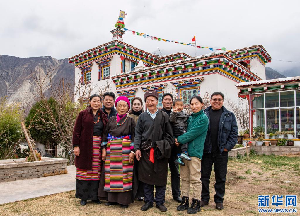 昂旺尼瑪(中)和家人在家門前合影留念(2月18日攝)。新華社記者 孫非 攝