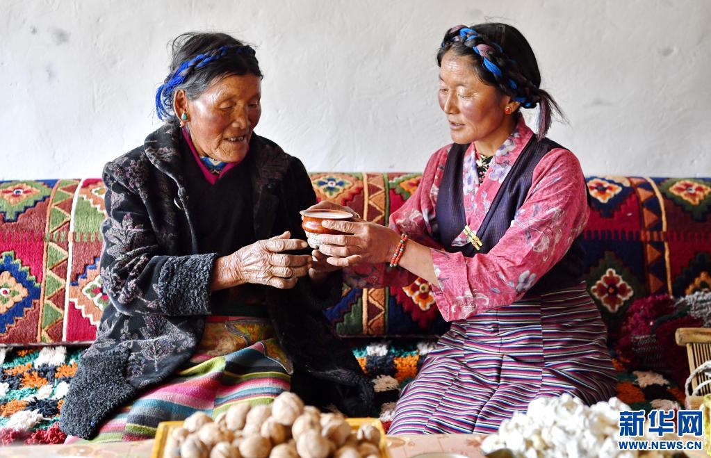 女兒尼瑪倉木決給阿媽拉巴(左)敬酥油茶(3月20日攝)。新華社記者 張汝鋒 攝
