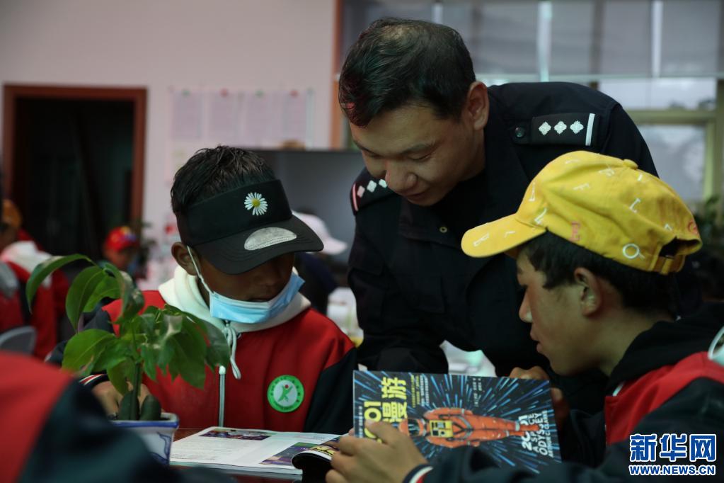 亞?wèn)|出入境邊防檢查站圖書室對(duì)駐地中學(xué)學(xué)生開放,民警為學(xué)生講解書本知識(shí)(張雨強(qiáng)攝,新華社發(fā))