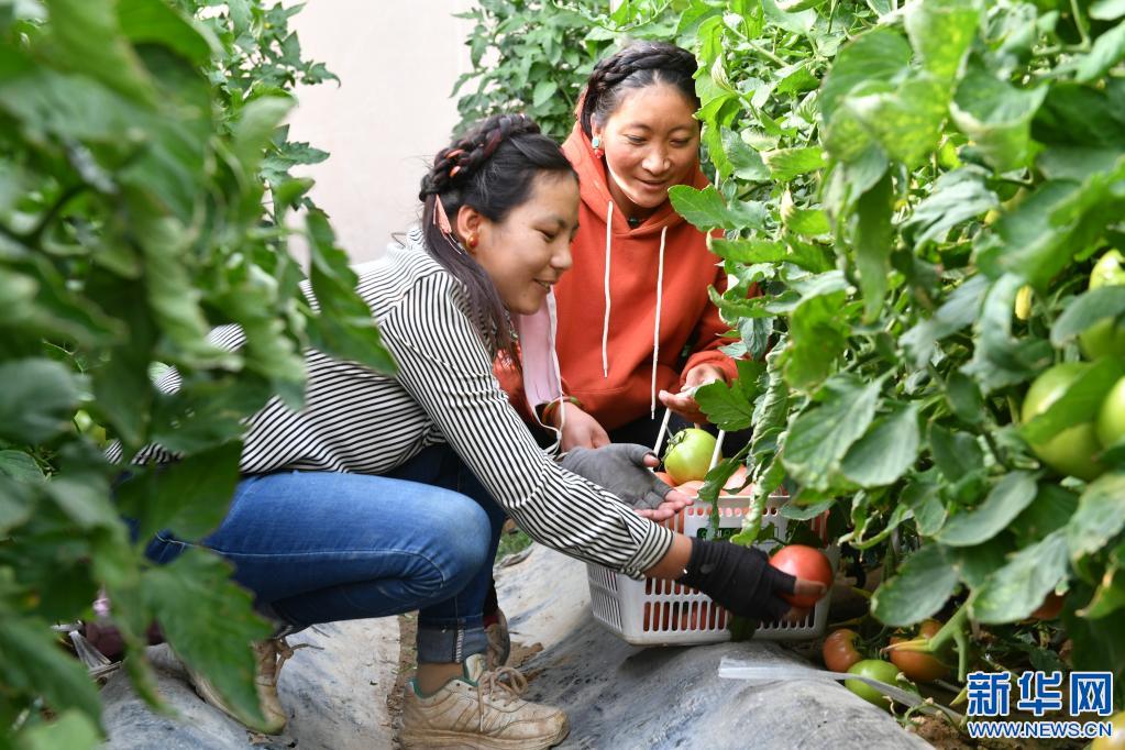 工作人員在西藏阿里噶爾縣生態(tài)農業(yè)產業(yè)園采摘西紅柿(2018年8月1日攝)。新華社記者張汝鋒 攝