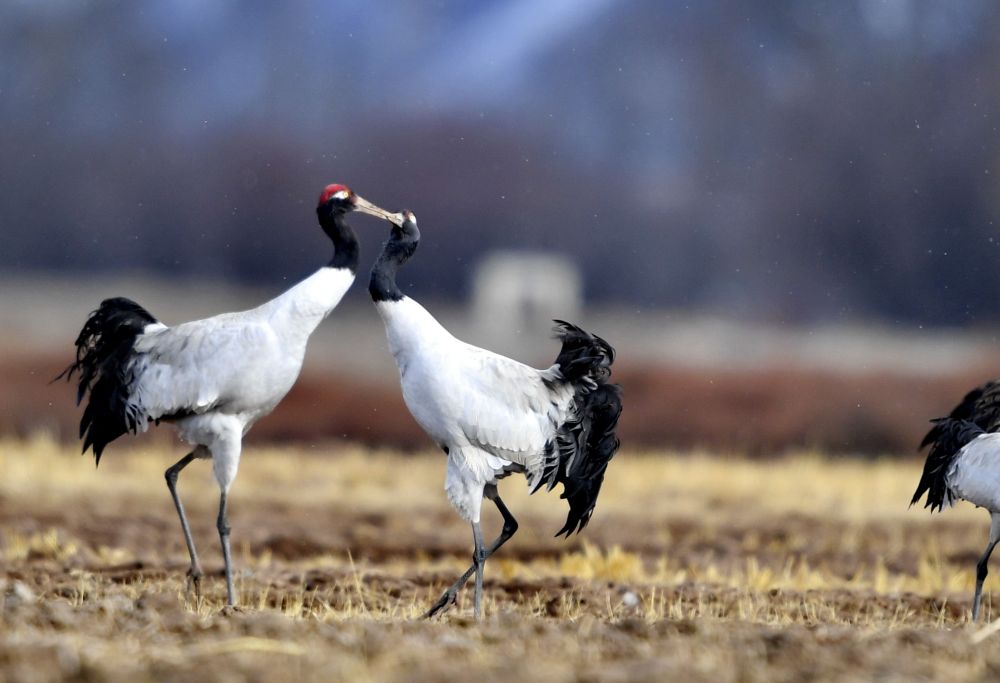 黑頸鶴在林周縣黑頸鶴自然保護區(qū)里“親吻”(2021年3月14日攝)。新華社記者 張汝鋒 攝