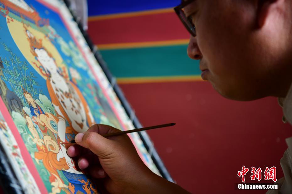 6月12日,2021年“文化和自然遺產(chǎn)日”西藏非遺展演展示系列活動(dòng)在拉薩舉行?;顒?dòng)現(xiàn)場(chǎng)融入了文藝演出、非遺展演、非遺產(chǎn)品展銷(xiāo)等內(nèi)容,市民游客可親身體驗(yàn)非遺產(chǎn)品的制作過(guò)程。圖為非遺傳承人在手繪唐卡。 中新社記者 貢嘎來(lái)松 攝