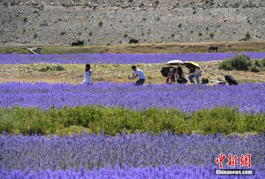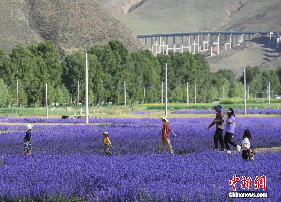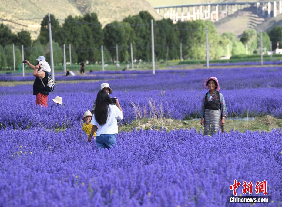 6月25日,位于西藏自治區(qū)拉薩市達孜區(qū)新倉村貝拉莊園的100畝薰衣草花海競相綻放,吸引不少游客和當(dāng)?shù)厥忻袂皝碛瓮?、拍照。中新社記?貢嘎來松 攝