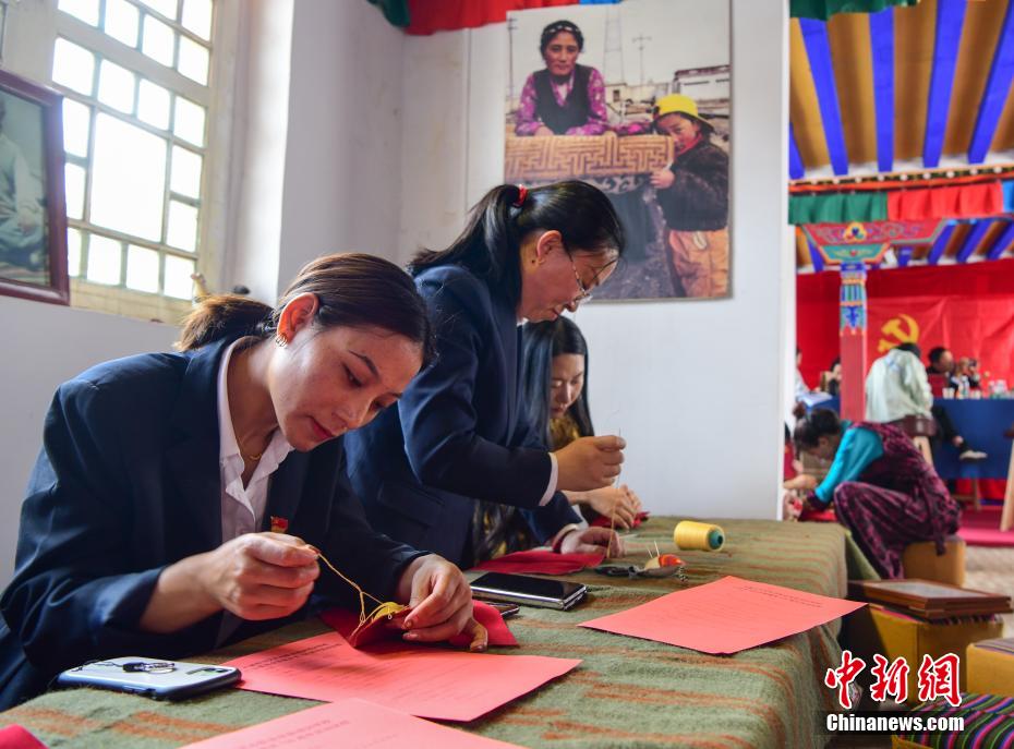 圖為西藏自治區(qū)民辦職業(yè)技能培訓(xùn)學(xué)校行業(yè)黨員縫制黨旗。貢嘎來松 攝