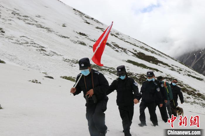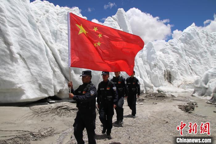 圖為普瑪江塘邊境派出所移民管理警察在邊境一線崗布冰川巡邏踏查。山南邊境管理支隊供圖