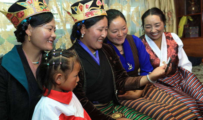 西藏自治區(qū)拉薩市墨竹工卡縣群眾通過手機(jī)收看慶祝大會(huì)。記者 洛桑 次旺 唐斌 潘多 攝