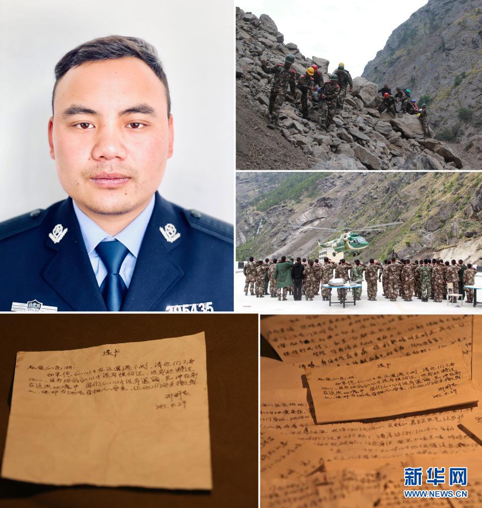 這是一張拼版照片:左上圖為共產黨員、邊防戰(zhàn)士邵明貴;右上圖和右中圖為邵明貴和戰(zhàn)友在轉移地震受災群眾;左下圖為邵明貴寫下的遺書;右下圖為吉隆邊防檢查站邊防戰(zhàn)士寫下的遺書(資料照片)。新華社發(fā)