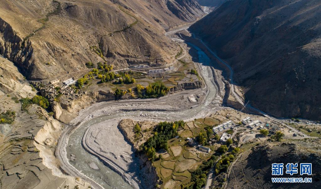 俯瞰西藏阿里地區(qū)札達縣楚魯松杰鄉(xiāng)楚松村楚魯組,蜿蜒的如許藏布江穿過村落(2018年9月16日攝,無人機照片)。新華社記者 旦增尼瑪曲珠 攝