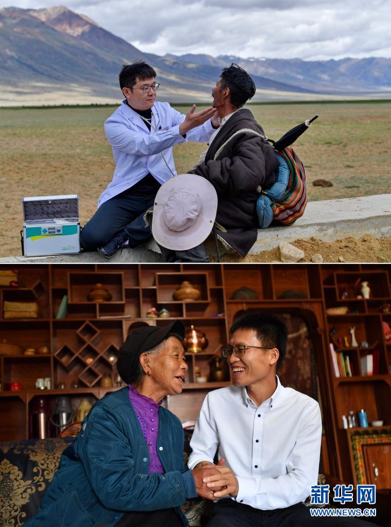 這是一張拼版照片:上圖為北京援藏醫(yī)生王克明(左)在西藏當雄縣格達鄉(xiāng)格達村牧場為牧民義診(2021年6月19日攝,新華社記者張汝鋒攝);下圖為在西藏林芝市米林縣,廣東援藏干部黃南蔭(右)與珞巴族老阿媽亞加在一起(2021年6月19日攝,新華社記者覺果攝)。新華社發(fā)