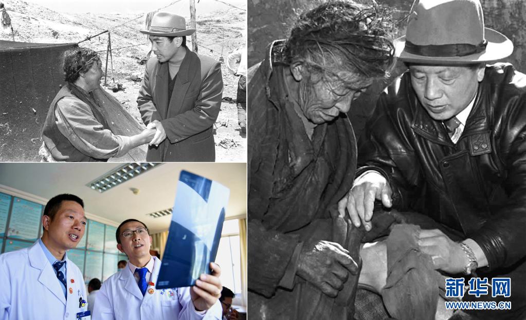 這是一張拼版照片:左上圖為來自陜西的援藏干部、阿里日土縣副縣長賈冗勇深入牧區(qū),幫助藏族牧民解決生產、生活的實際困難(新華社記者土登攝,1997年11月11日發(fā));左下圖為2017年8月3日,北京積水潭醫(yī)院援藏醫(yī)生龔曉峰(右)和北京天壇醫(yī)院援藏醫(yī)生李家謀在拉薩市人民醫(yī)院骨科病房內查看患者的X光片,進行工作交接(新華社記者晉美多吉攝);右圖為孔繁森(右)在阿里日土縣過巴鄉(xiāng)為孤寡老人益西卓瑪治?。ㄐ氯A社記者土登攝,1994年12月26日發(fā))。新華社發(fā)