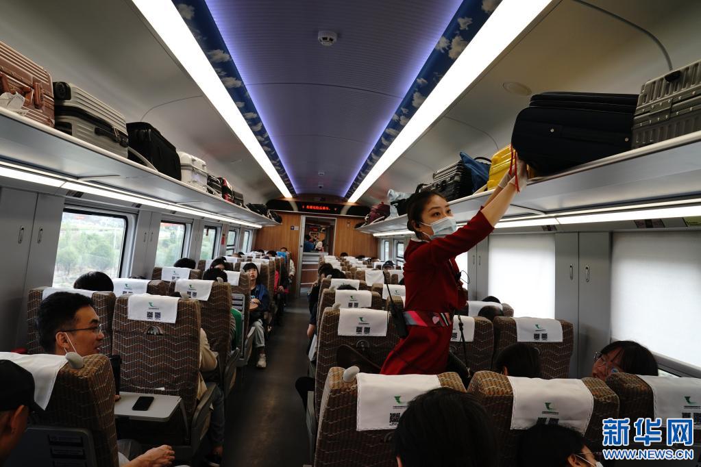 拉林鐵路復(fù)興號(hào)列車(chē)乘務(wù)員正在為旅客整理行李(2021年7月8日攝)。新華社記者 劉洪明 攝