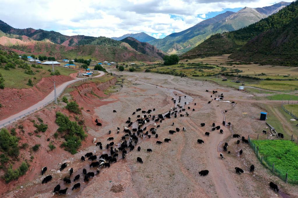昌都市類烏齊縣賓達(dá)鄉(xiāng)央宗村央宗牦牛育肥基地的牦牛(2020年9月21日攝,無人機(jī)照片)。新華社記者 詹彥 攝