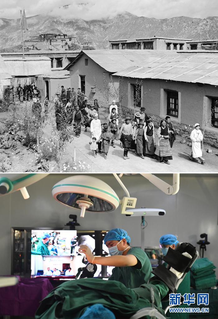 拼版照片:上圖是20世紀(jì)50年代,前往拉薩市人民醫(yī)院看病的藏族群眾在護(hù)士陪同下到醫(yī)療室去就診(新華社記者任用昭攝);下圖是2021年4月19日,拉薩市人民醫(yī)院骨科醫(yī)生通過(guò)5G通信技術(shù),在北京積水潭醫(yī)院專(zhuān)家遠(yuǎn)程指導(dǎo)下使用骨科機(jī)器人開(kāi)展手術(shù)(新華社記者孫瑞博攝)。新華社發(fā)