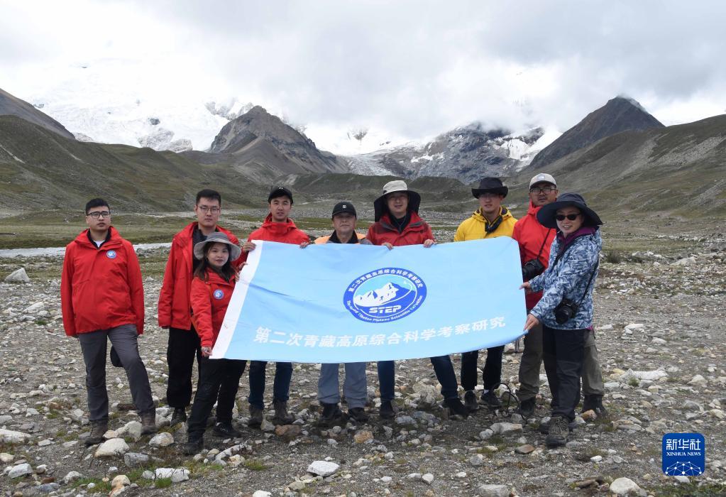 8月24日,在西藏日喀則市區(qū)域內(nèi)的喜馬拉雅山脈一處雪山下,中科院地理科學(xué)與資源研究所客座教授李渝生(中)和年輕隊(duì)員們合影?!⌒氯A社記者 杜剛 攝