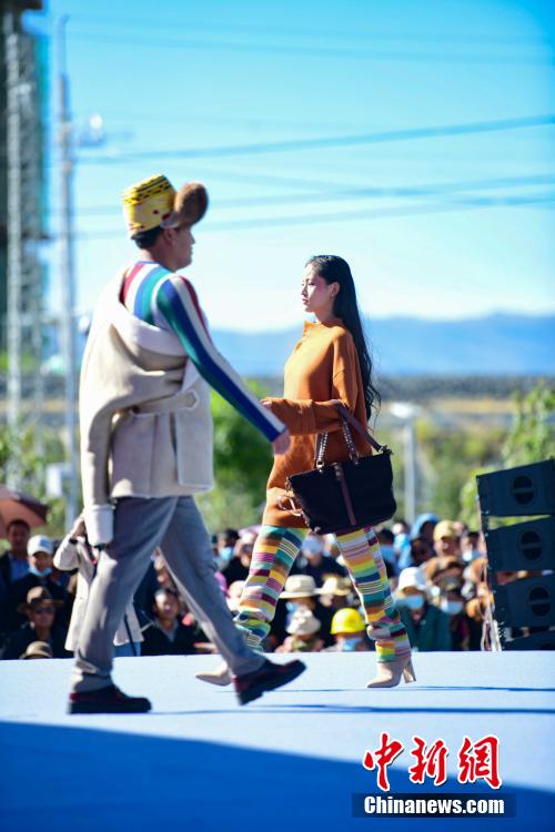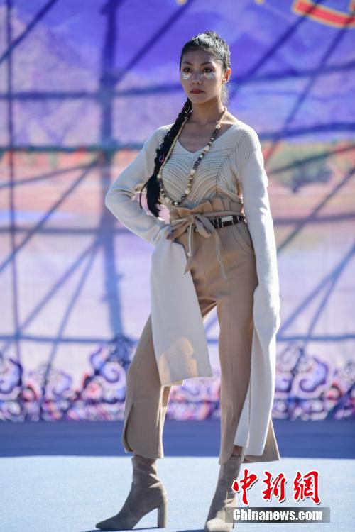 圖為當?shù)夭刈迥L厣碇把鹏敳夭肌爆F(xiàn)代藏裝服飾進行走秀。貢嘎來松 攝